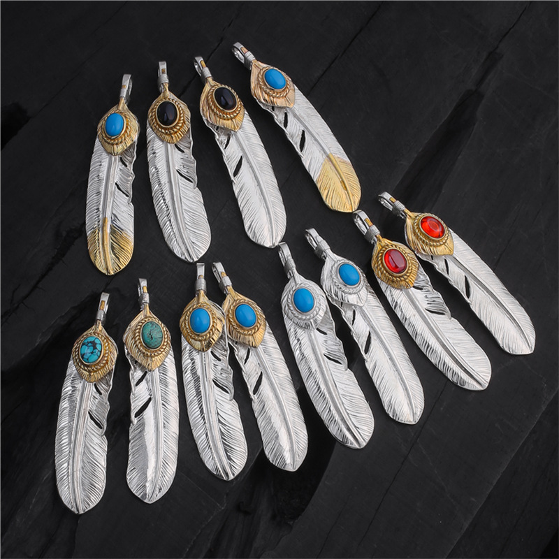 Japanese Takahashi Goro Turquoise Feather Pendant 925 Silver Handmade Replica Goros Necklace for Men and Women Couples