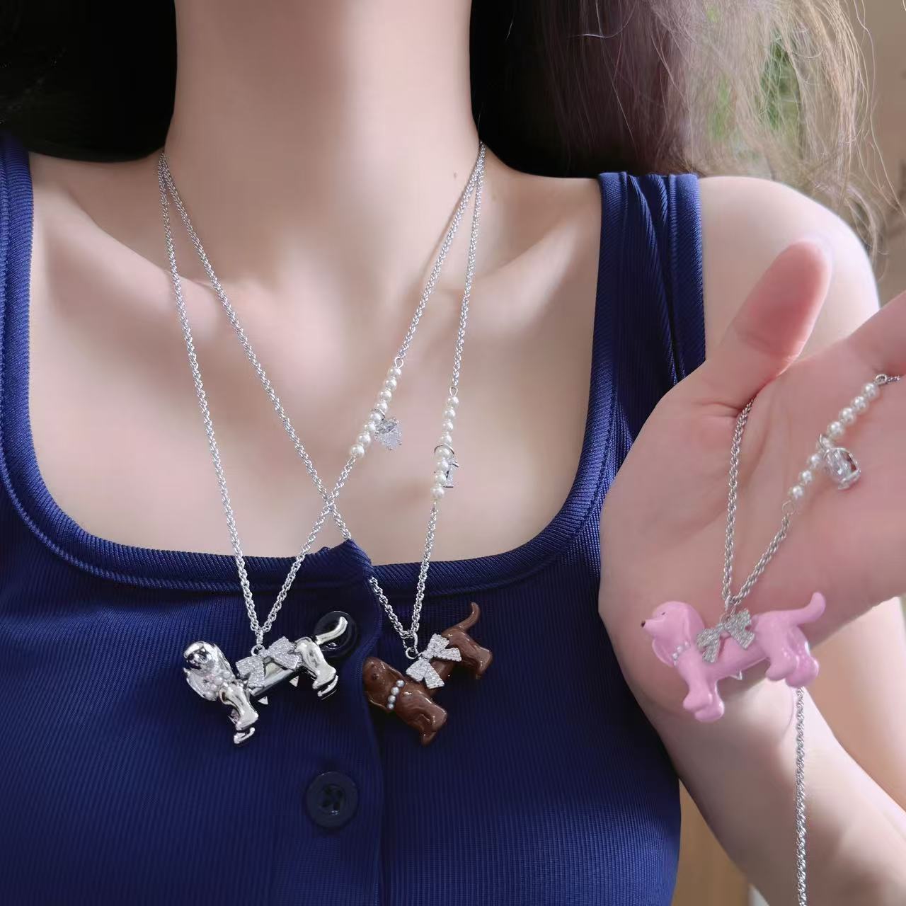 Sweet and Cool Micro-Inlaid Zircon Bow Oil-Drip Dachshund Puppy Necklace for Women, Niche Fashion Versatile Choker Collarbone Chain Trend