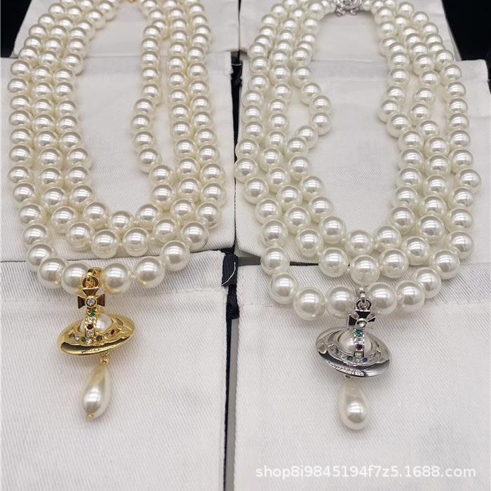 Empress Dowager Vivian Necklace Light Luxury High-level Three-layer Pearl Three-dimensional Water Drop Necklace Planet Clavicle Chain