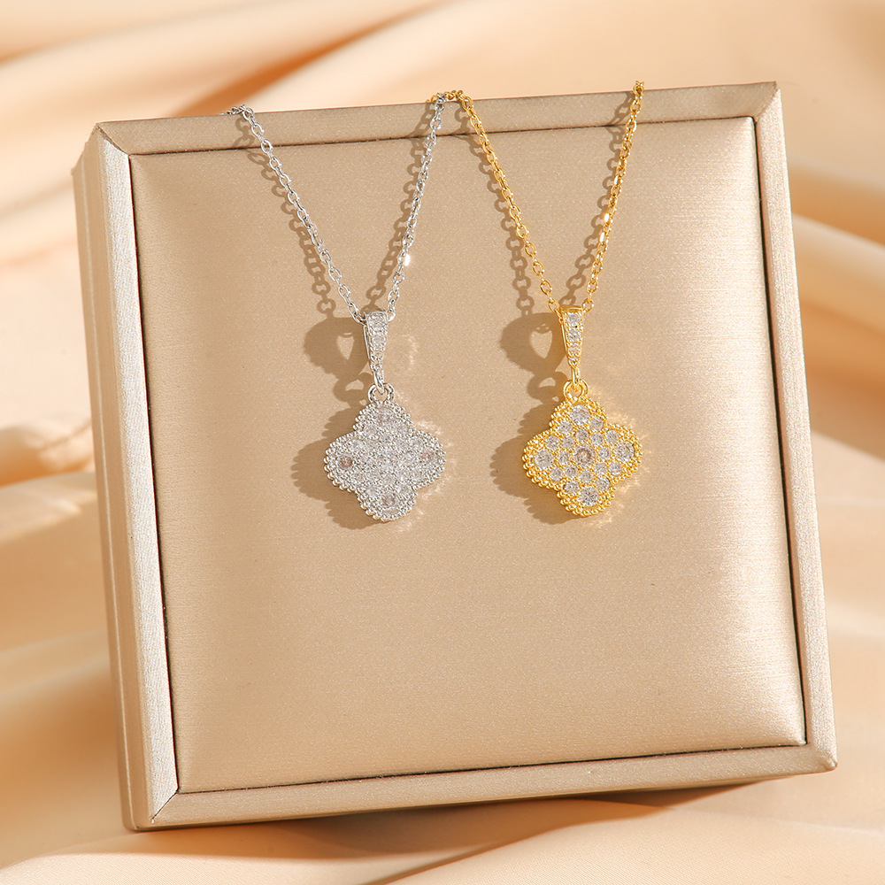 Chanel Style Luxury Full Diamond Micro Diamond Necklace Women's Four-leaf Clover Pendant Ins Cyber Celebrity Clavicle Chain Accessories