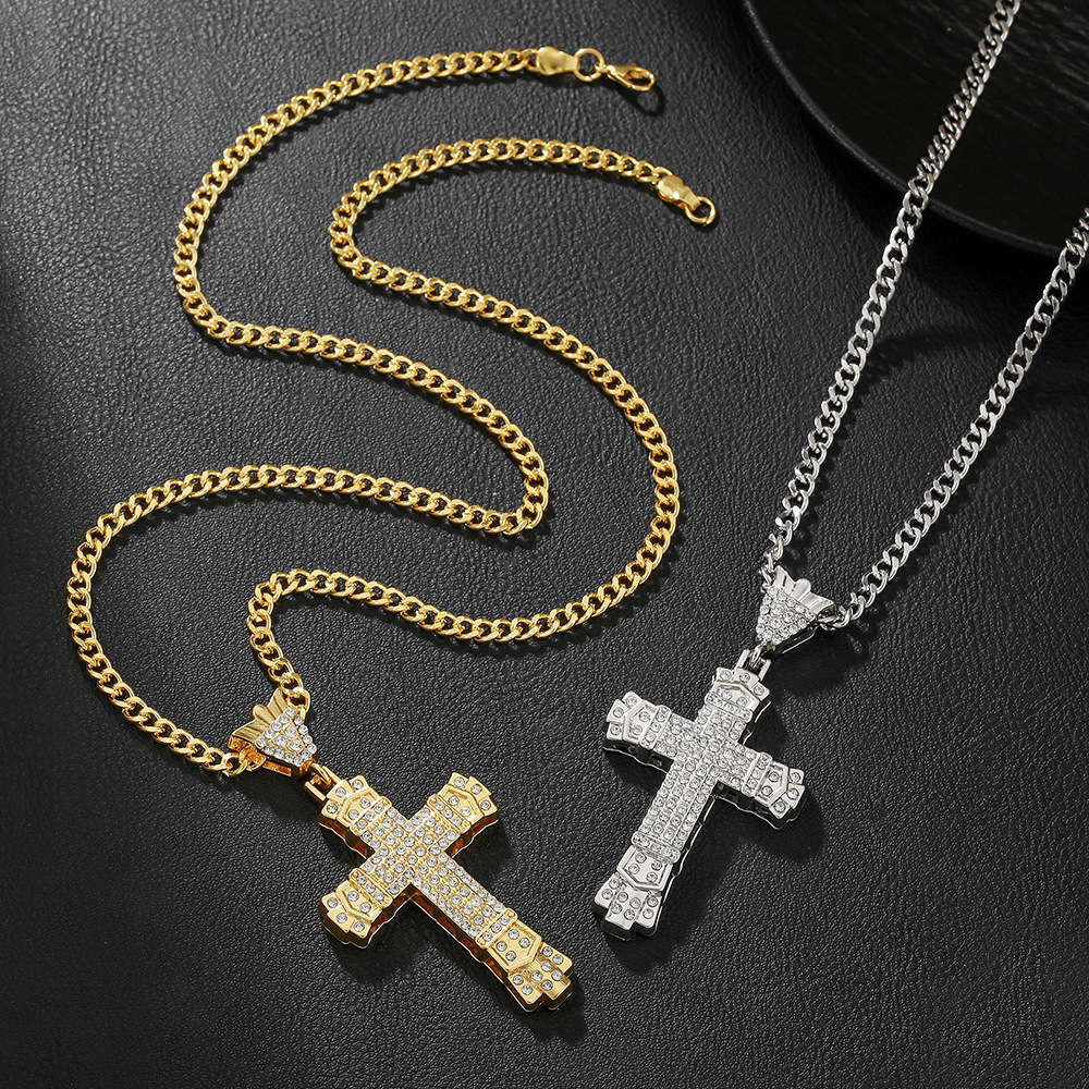 European and American Hip-Hop Full Diamond Retro Hollow Cross Pendant Necklace Diamond Pendant Men's Necklace Gold-Plated Diamond Necklace