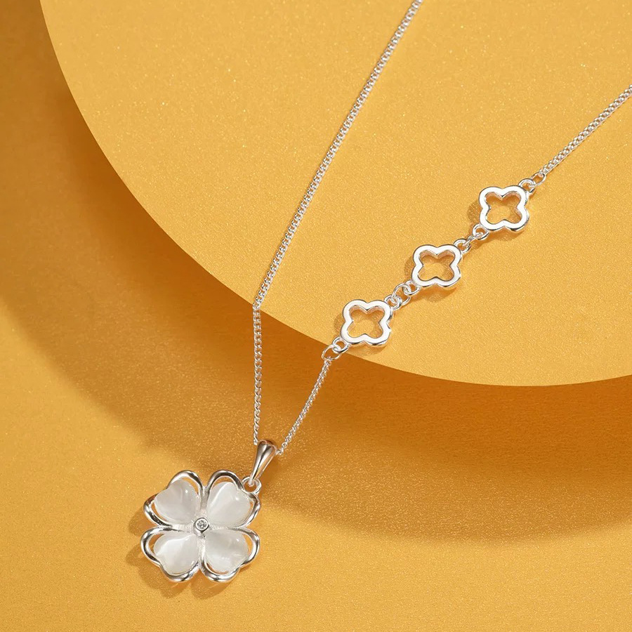 999 Pure Silver Natural Cat's Eye Stone Necklace for Women, Four-Leaf Clover Pendant, Light Luxury, Simple, High-End, Fashionable Autumn and Winter Jewelry