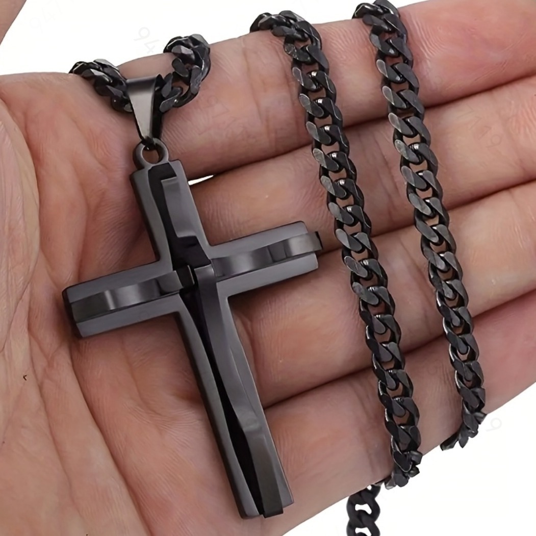 Cross-border temu Popular Faith Black Inverted Triangle Pendant Necklace Hip-hop Men's Cross Pattern Necklace Jewelry