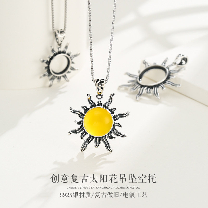 925 Sterling Silver Pendant Empty Support for Men and Women Retro Sunflower Round Style Inlaid with Jade Beeswax Pendant Buckle Head 8-15m