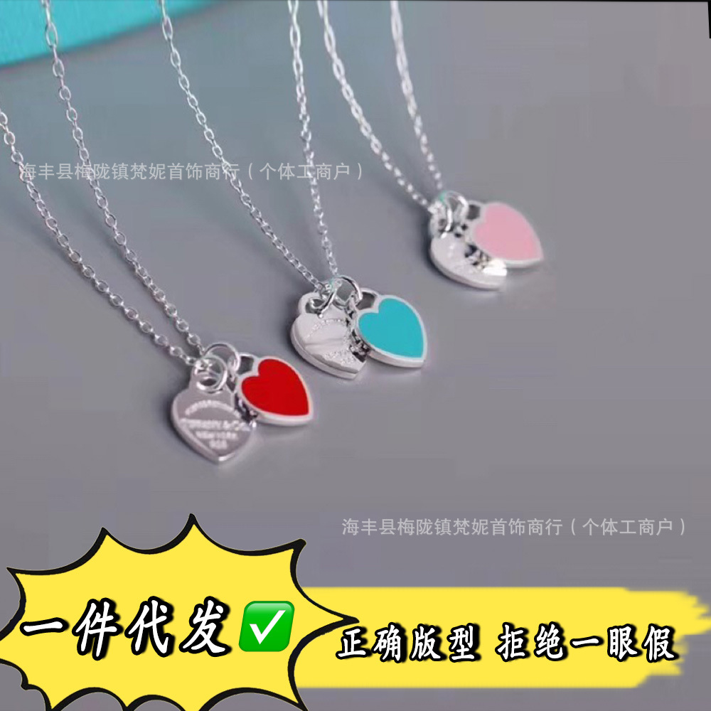 925 Sterling Silver T Family Love Necklace Women's Pink Blue Enamel Color Explosions Clavicle Chain Double Love Pendant Internet Celebrant