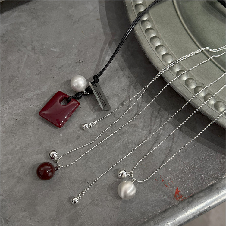 Extremely simple style drawing ball sweater chain wine red ball square high-level feeling ins net red same style design feeling necklace