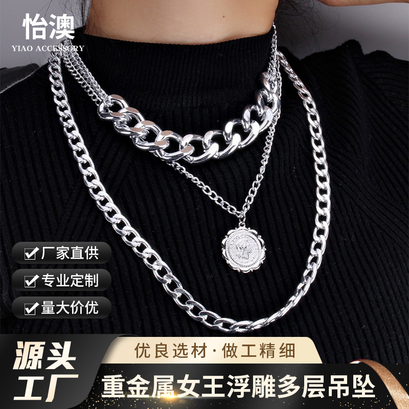 European and American cross-border jewelry heavy metal texture Queen relief pendant necklace women's simple multi-layer sweater chain necklace