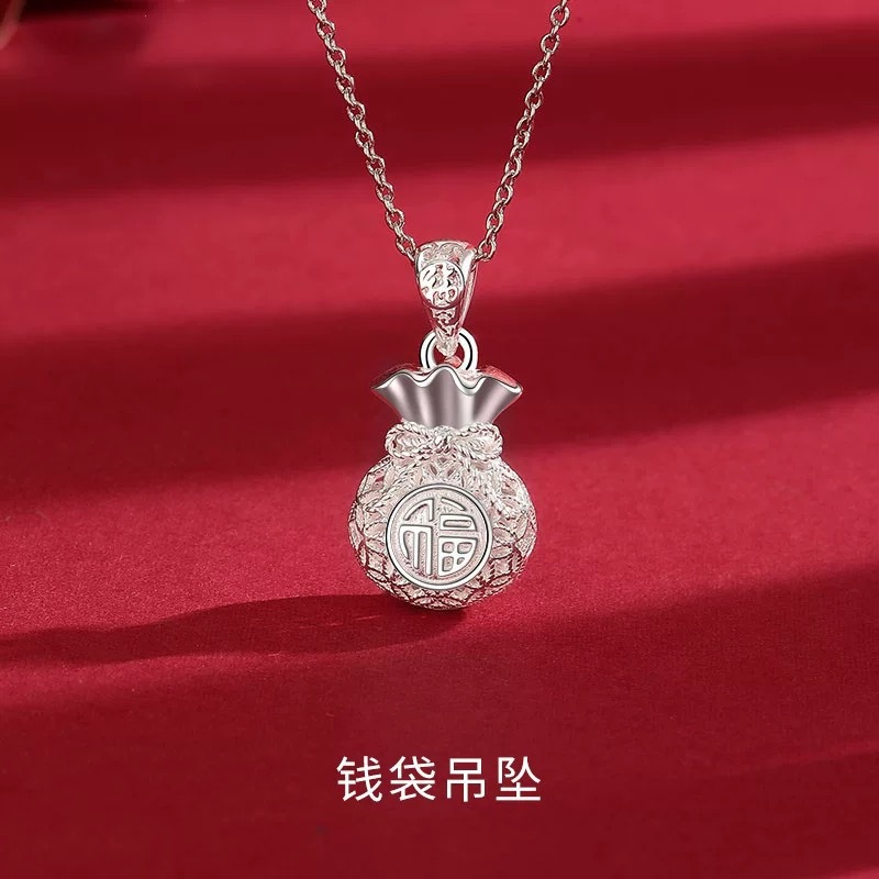 Silver 999 Money Bag Lucky Bag Pendant Hollow Out Fortune Character Pure Silver Necklace for Women, Chinese Style Trendy Versatile Necklace Jewelry Gift