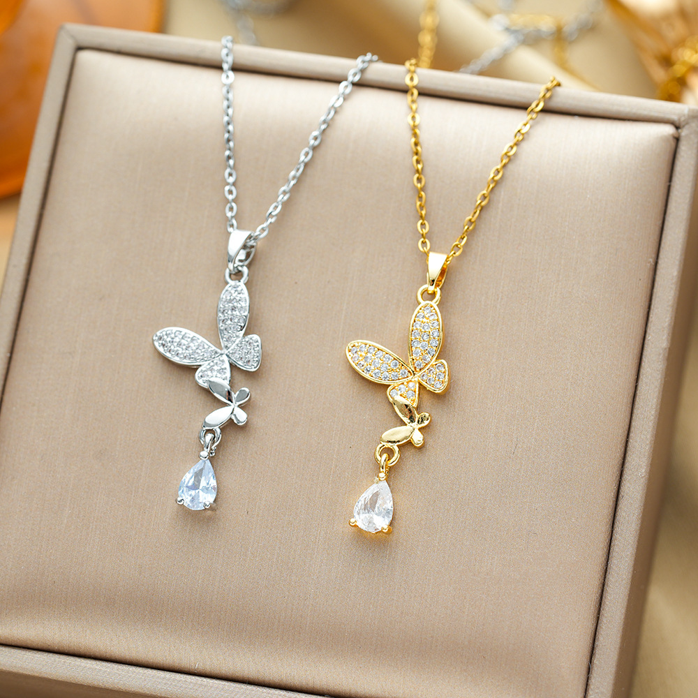 Cross-border Korean-style micro-inlaid butterfly titanium steel necklace female niche design clavicle chain tassel zircon water drop jewelry