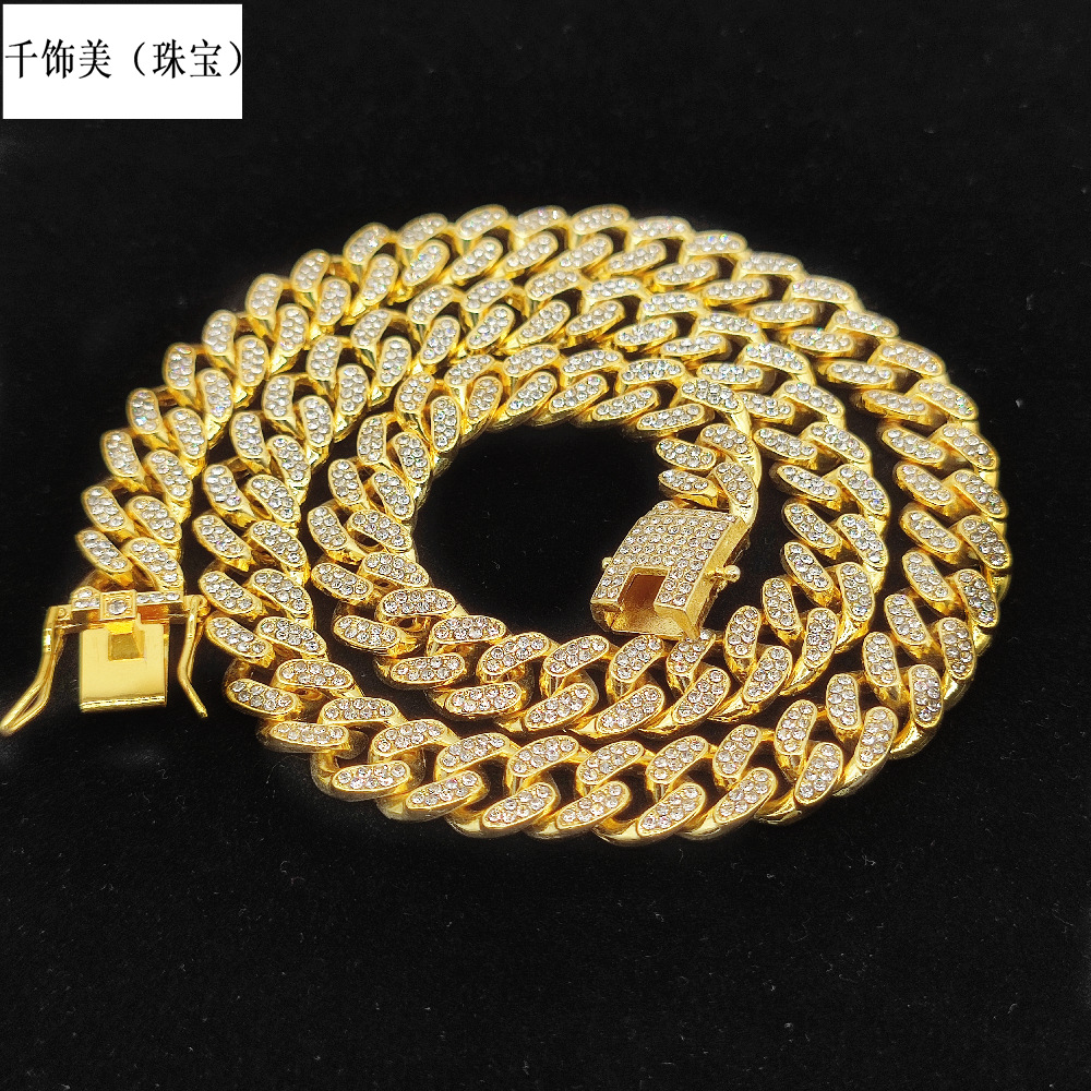 Qianshimei European and American hip hop zinc alloy 12.5mm wide gold plated full diamond full diamond large gold chain Cuban chain necklace