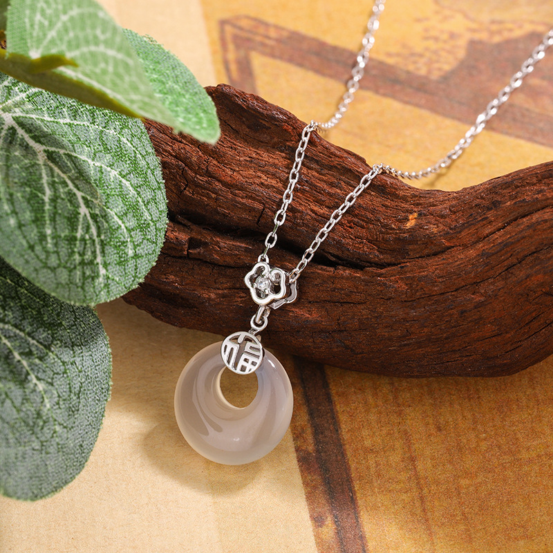 S999 Pure Silver Fortune Character Peace Pendant Chalcedony Necklace for Women, Ethnic Style Palace Clavicle Chain, Light Luxury Niche Necklace Jewelry