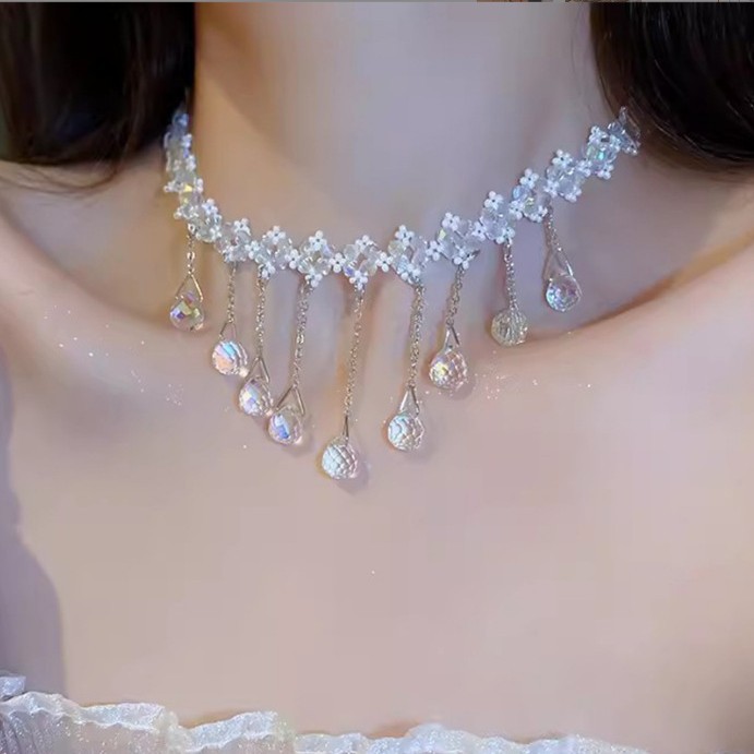 Light Luxury Super Flash Crystal Tassel Pearl Necklace Women's Summer All-match High-end Necklace Chain Fashionable Elegant Necklace