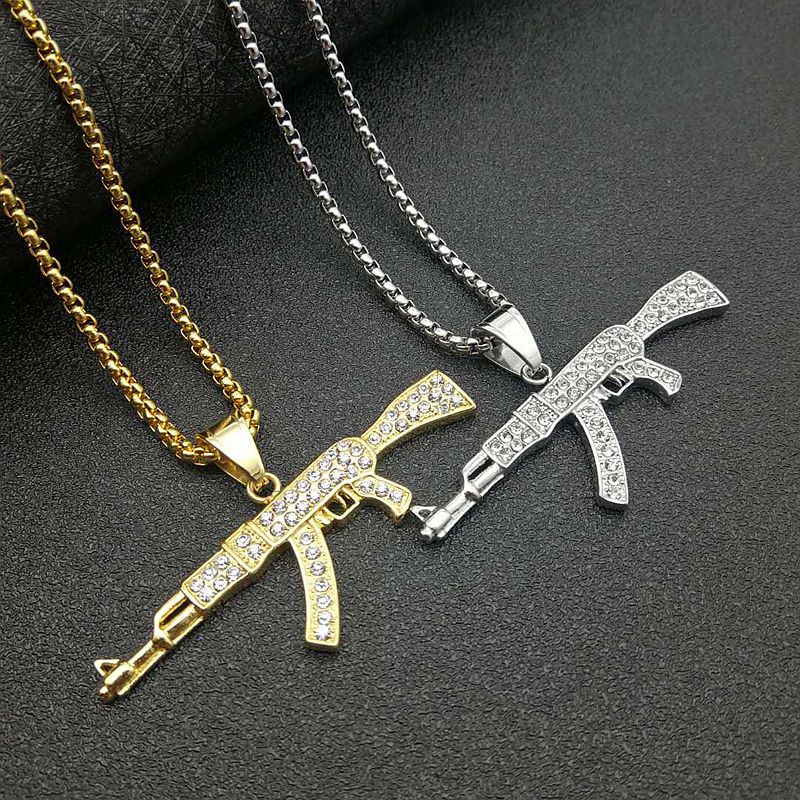 European and American cross-border popular hip hop HIPHOP jewelry titanium steel gold-plated rhinestone AK47 pendant necklace