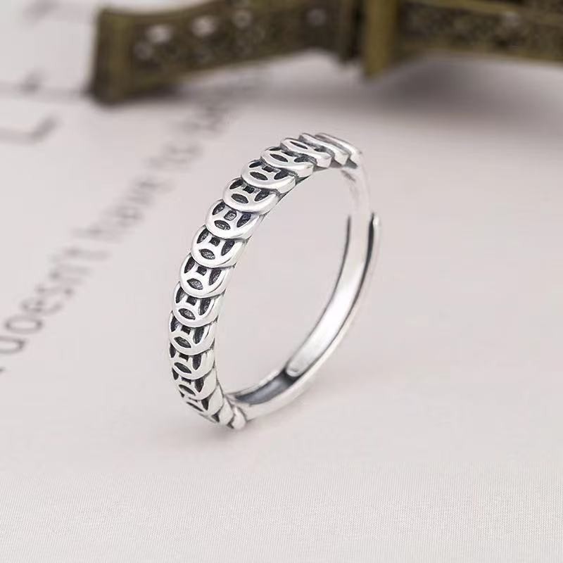 S925 Sterling Silver Copper Coin Ring for Women, Thai Silver Vintage Money Multi-Ring Index Finger Korean Version Ins Retro Personality Fortune Ring