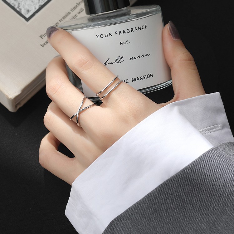 Double-line cross open index finger ring female sterling silver single ins fashion personality adjustable silver ring simple