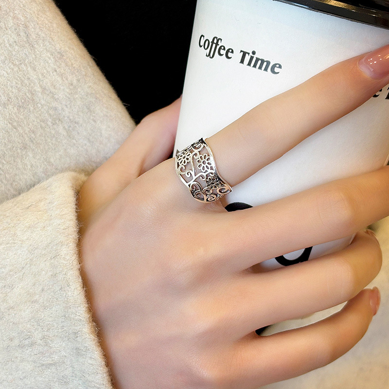 S925 Sterling Silver Vintage Hollow Flower Ring for Women, Korean and Japanese Style, Simple Niche Design, Light Luxury Versatile Open Ring