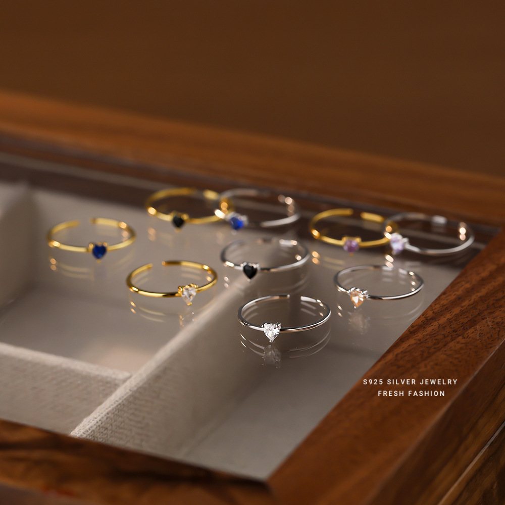 S925 Sterling Silver Heart White Zirconium Ring Women's Simple Small Ring Colorfulful Zircon Ring Personalized Open Ring Small Tail Ring