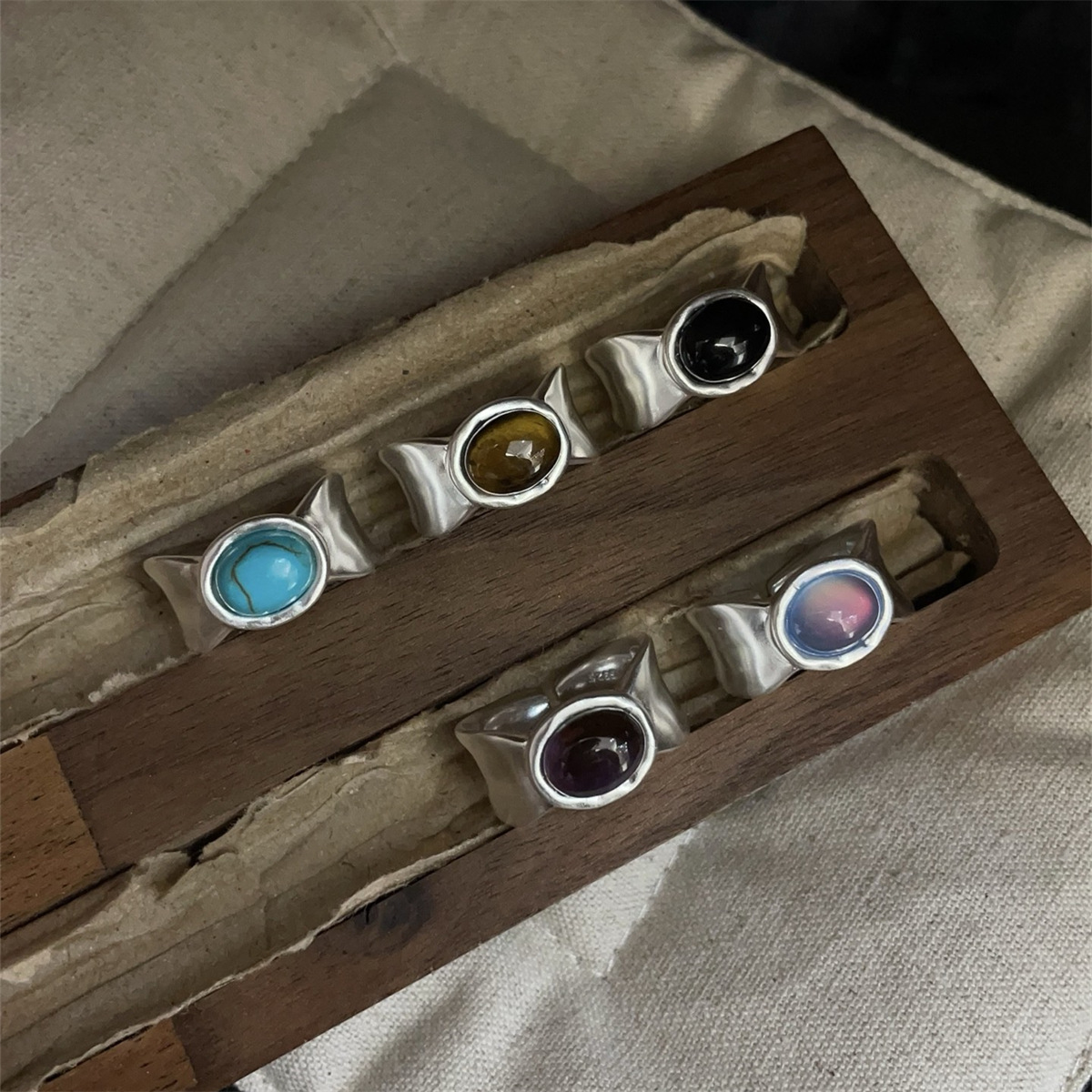 S925 Silver brushed matte satin inlaid oval natural stone opening ring cold high-grade heavy-duty texture