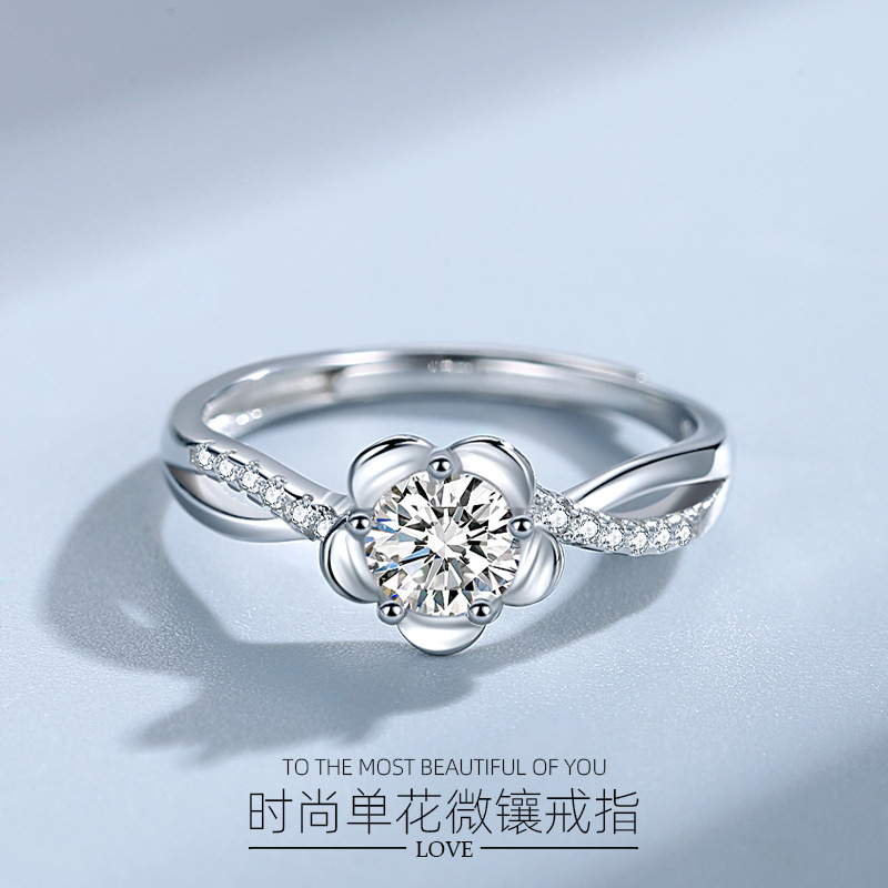 Sterling Silver S925 Peach Blossom Women's Ring with Diamond Flower Korean Style Light Luxury Finger Ring Japanese and Korean Style Design Sense Fashion