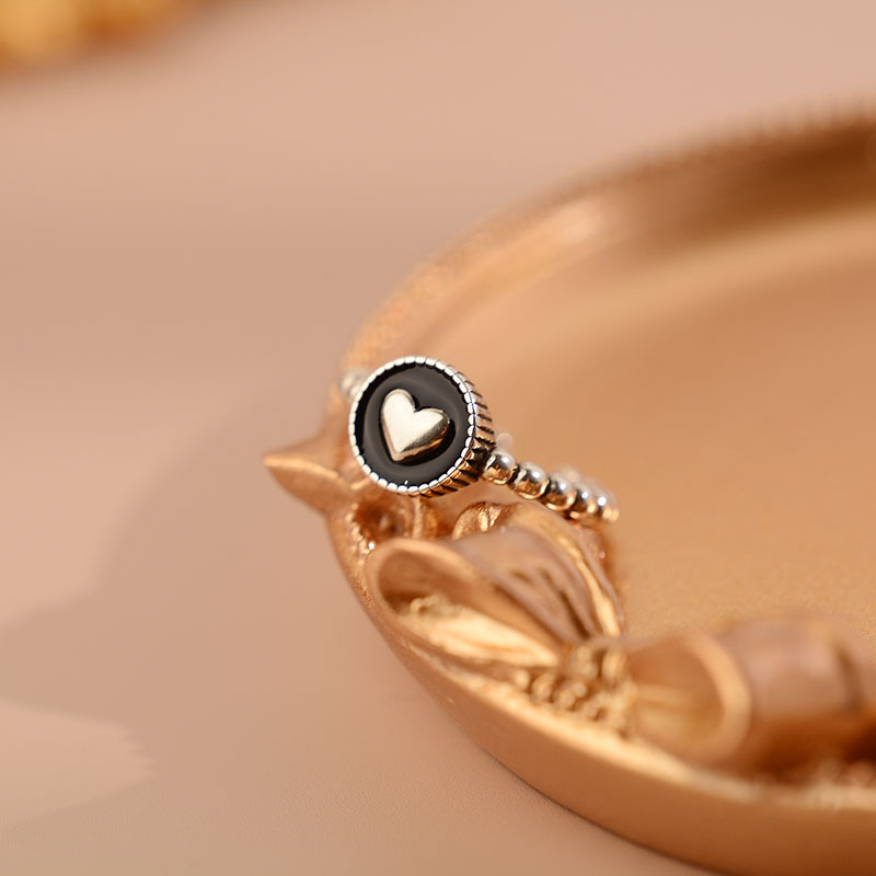 Korean ins Simple Thai Silver Retro Black Love Open Ring Women's Internet Celebrity Light Luxury Exquisite Heart-shaped Ring Trendy