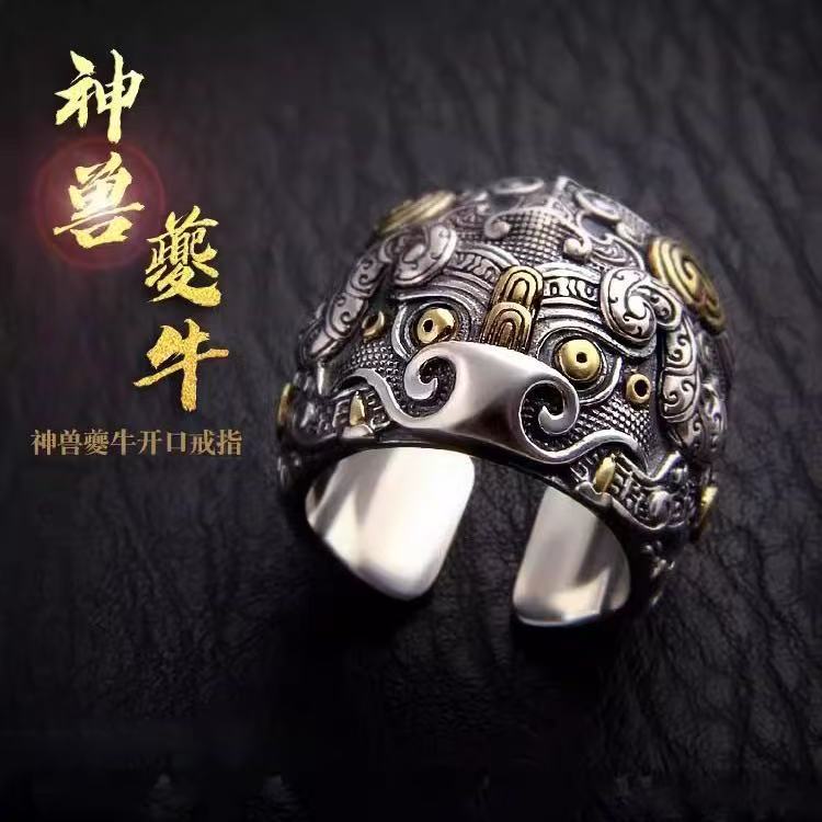 Fashion S925 Sterling Silver Mythical Beast Ku Ni Ring for Men, Vintage Personality Niche Index Finger Mythical Beast Ku Ni Open Ring