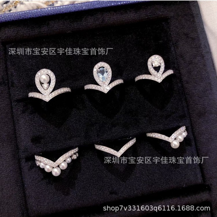V-shaped Pearl Ring Women's Full Diamond Inlaid s925 Silver Plated 18k Rose Gold Drop Crown Korean Stacked Niche Ring