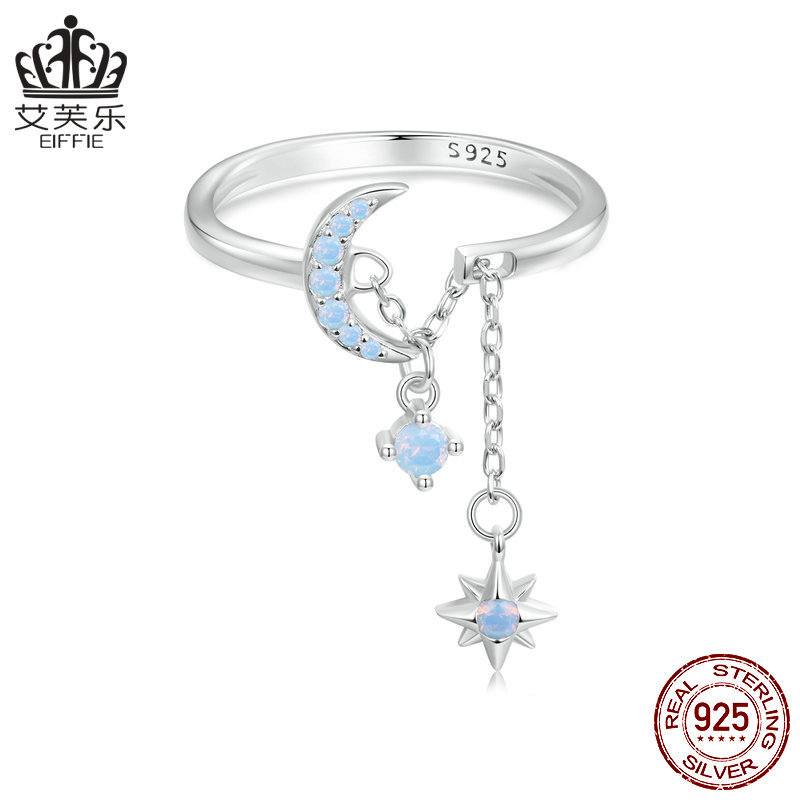 Bisal Blue Star and Moon Chain Open Ring S925 Sterling Silver White Golden Plated Adjustable Ring Jewelry Hand Jewelry for Women