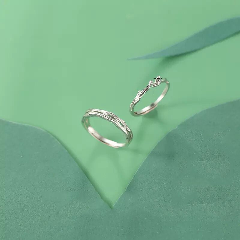 "Eucalyptus and Bird" Silver Couple Rings, a Pair of Niche Design Engraved Male and Female Couple Rings, 2025 New Style
