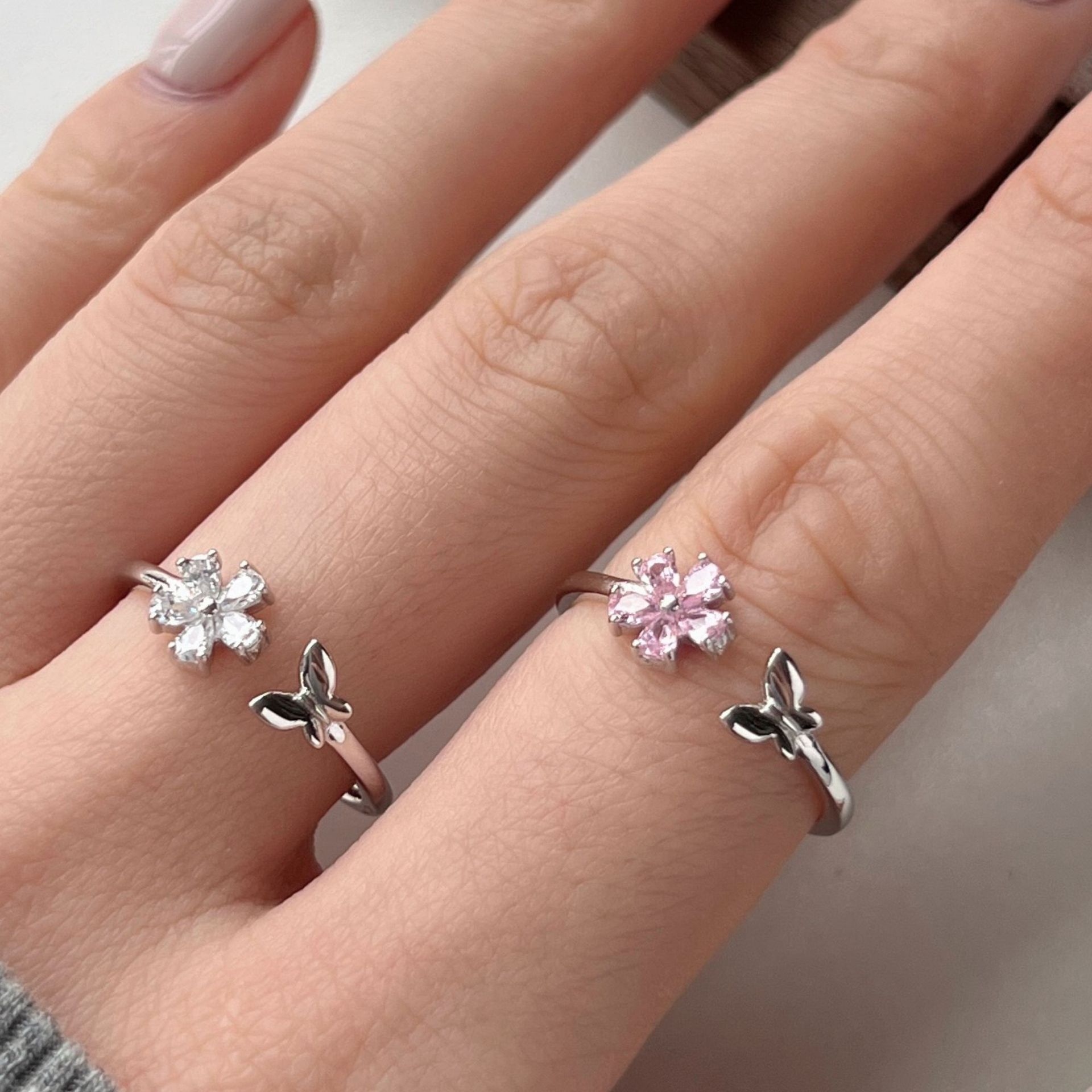 S925 Sterling Silver Flower Ring Women's Inlaid Water Drop Pink Diamond Zircon Glossy Butterfly Design Japanese and Korean Open Ring