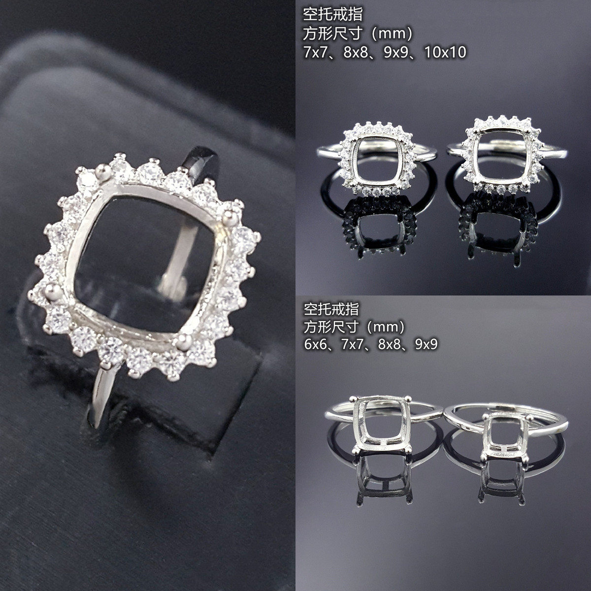 Simple S925 silver ring empty support fat square Asche square chamfer 678910mm cut surface drill Princess
