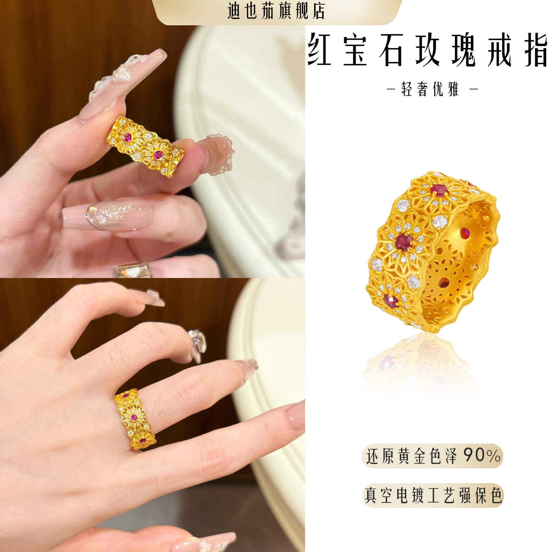 Gold Color New Red Rose Window Gemstone Hollow Ring Sand Gold Color-Preserving Ring Accessories Women's Gift