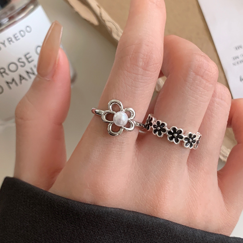Black Distressed Opening Adjustable Flower Ring Women's Vintage Sweet Distinctive Finger Ring Niche Design Ring