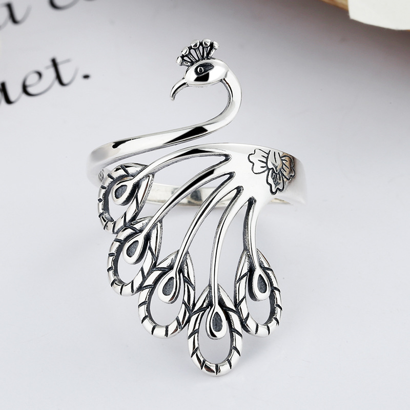 Creative Retro Peacock S925 Sterling Silver Wide Face Ring Female Ethnic Style Thai Silver Phoenix Old Ring Ring