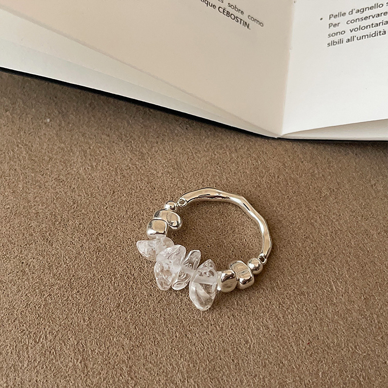 Irregular White Crystal Broken Silver Ring for Women, Simple Design, Stylish, Versatile, Fashionable, Trendy Commuter Ring