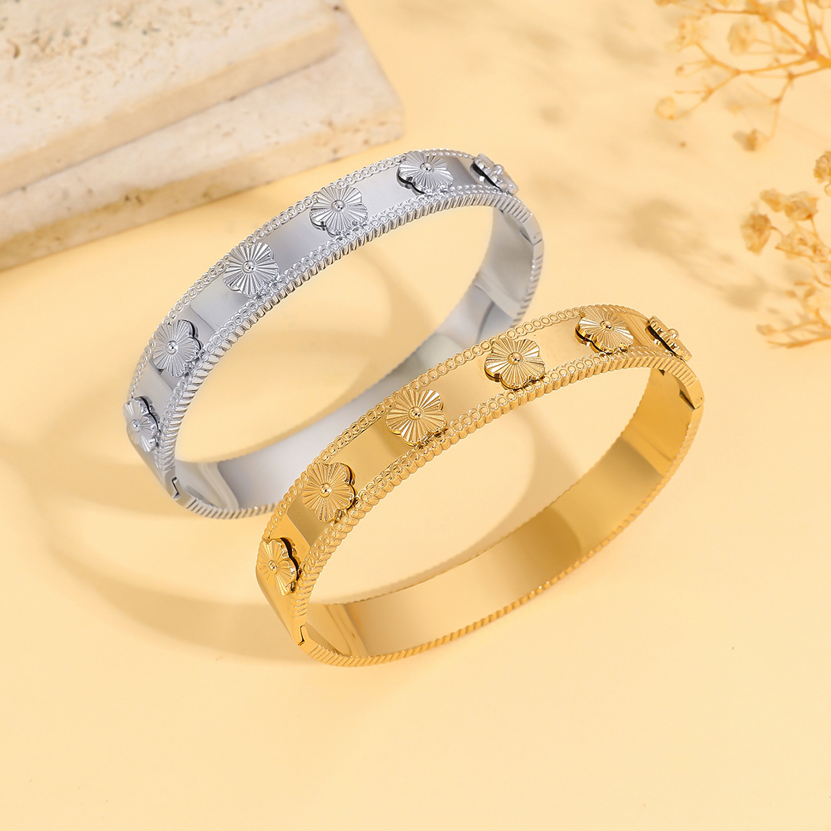 Bracelet for Women Cross-Border Stainless Steel Five-Petal Flower Bracelet Titanium Steel Five-Petal Flower Fashion Flower Temperament Open Bracelet Jewelry
