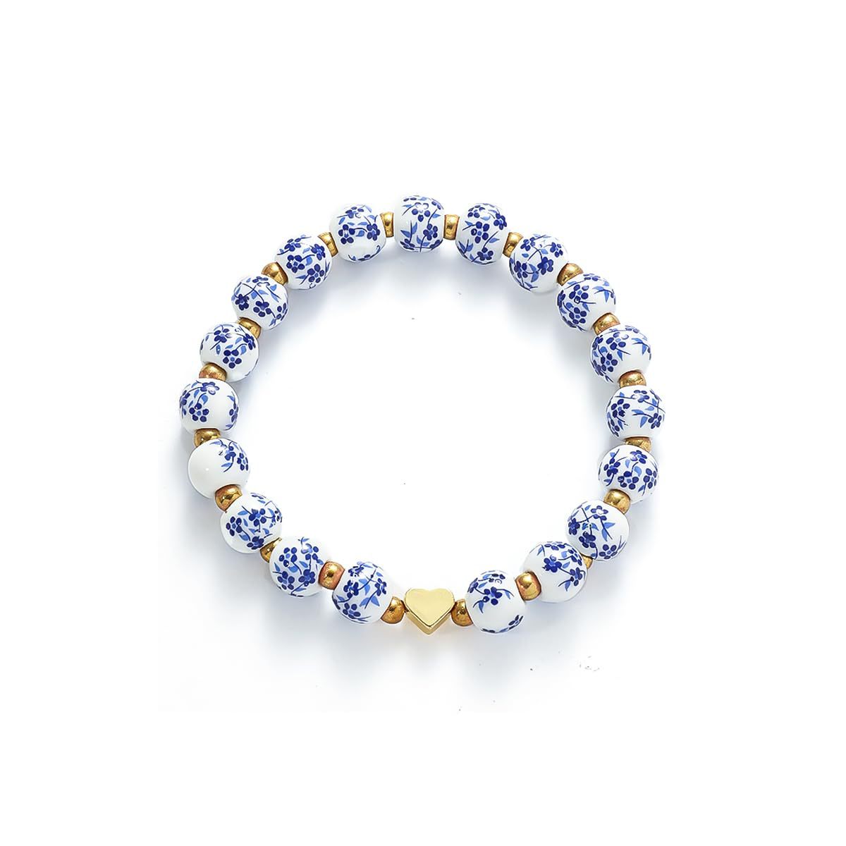 Chinese Style Ceramic Bead Bracelet Stainless Steel Heart Gold Bead Blue Floral Bead Bracelet Blue and White Porcelain Bead Heart Bracelet