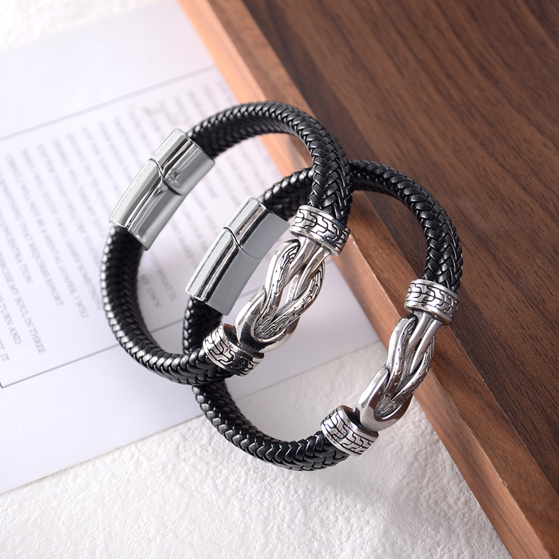 Cross-Border Popular Woven Leather Rope Bracelet Stainless Steel Figure-Eight Buckle Decoration European and American Tough Guy Style Men's Jewelry Wholesale