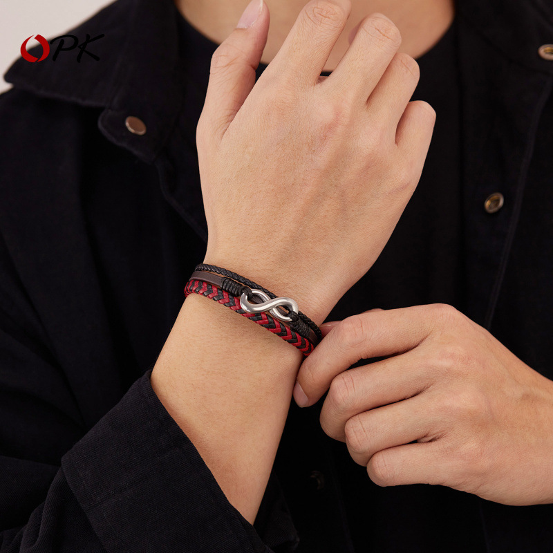 OPK European and American Cross-border Fashion Leather Bracelet Men's Stainless Steel Unlimited Symbol Personalized All-match Leather Bracelet
