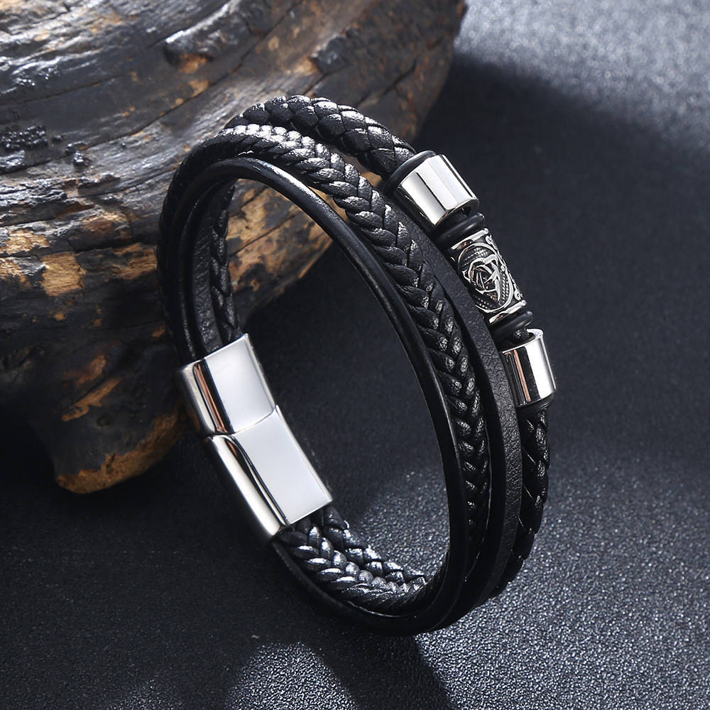 Factory Direct Sales Cross-Border Popular Stainless Steel Magnetic Buckle Leather Rope Bracelet Men's Multi-Layer Simple Woven Jewelry Wholesale