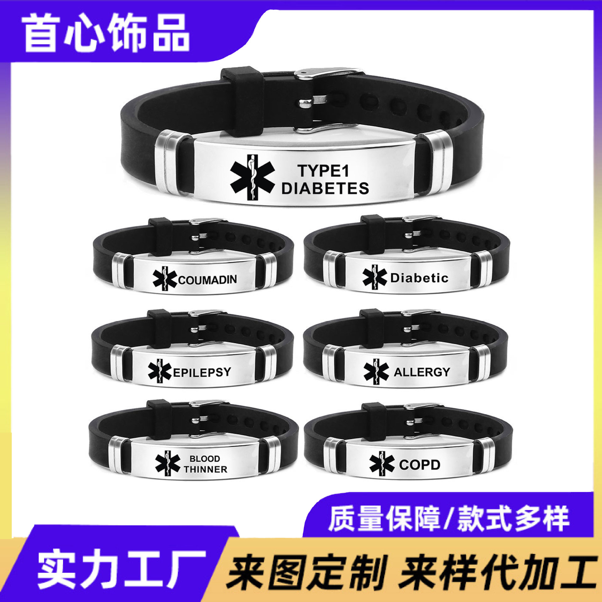 Warning bracelet Type 1 Diabetes stainless steel Life star medical silicone bracelet engraved