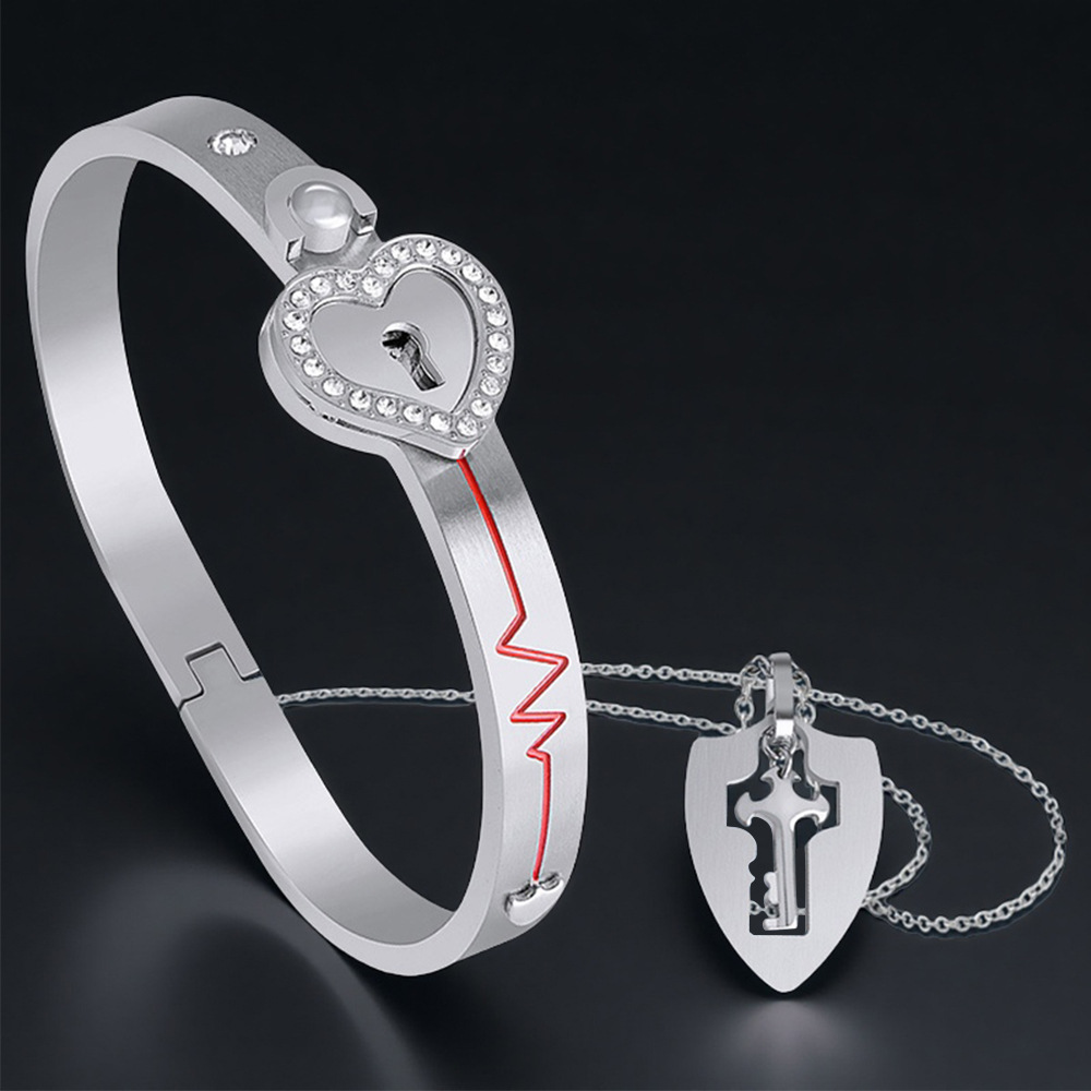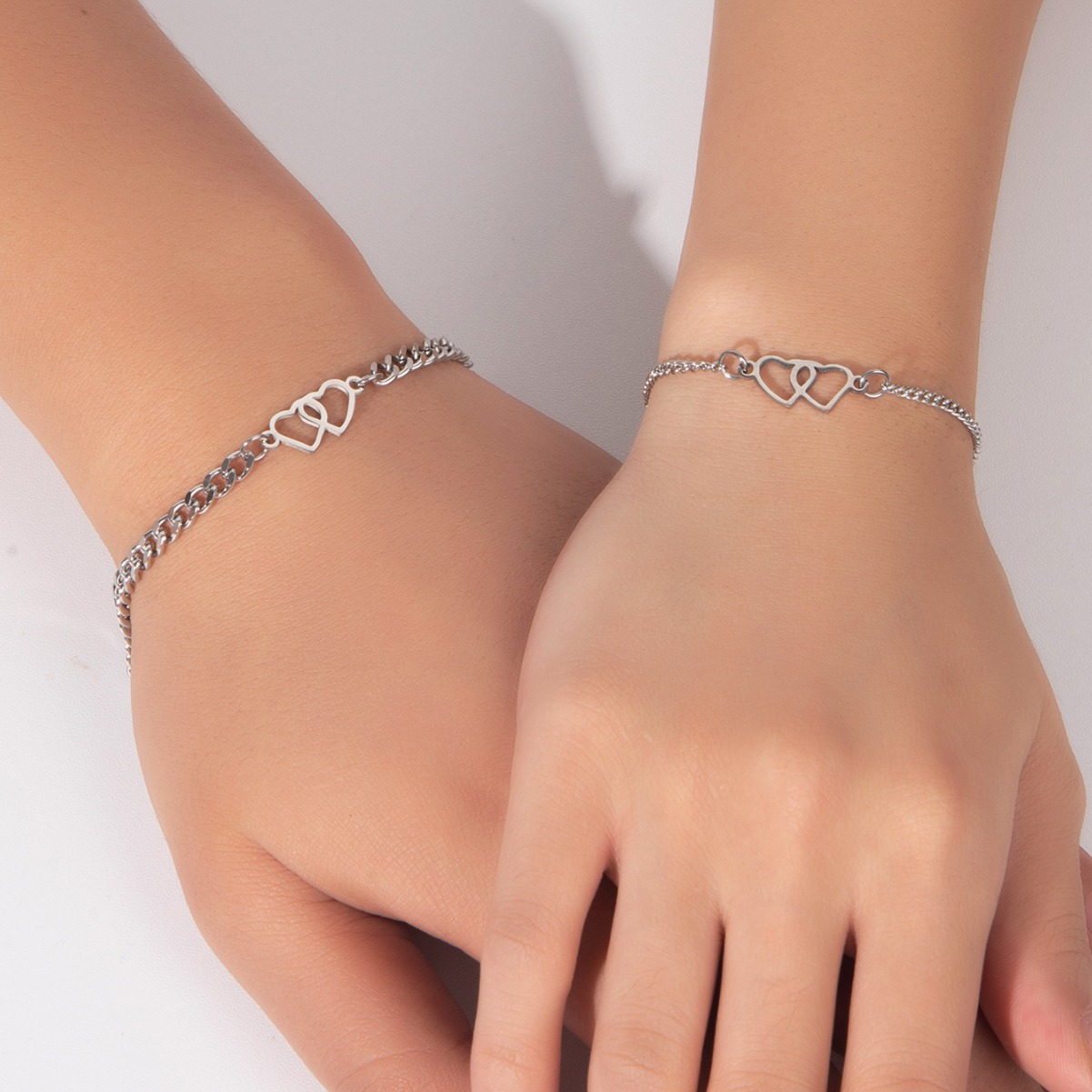 European and American Cross-border Fashion New Hollow Double Love Couple Stainless Steel Heart-shaped Bracelet Jewelry suit 2-piece Set