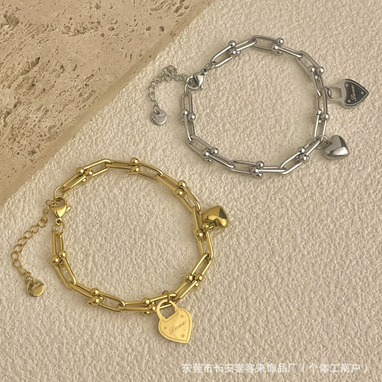 European and American Stainless Steel Love Ball Simple Bracelet Cross-border 18k Gold Plated Color Peach Heart Key Bracelet