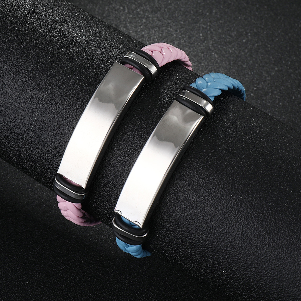 Cross-Border European and American New Stainless Steel Simple Silver Color Bracelet Light Plate Lettering Leather Braided Bracelet Men's Bracelet