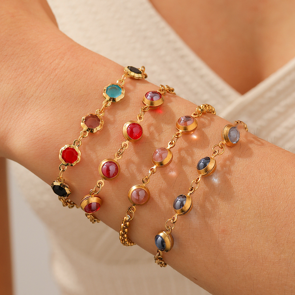 Elegant Versatile Titanium Steel Plated with 18K Real Gold European and American High-End Colorful Stone Multi-Color Round Stainless Steel Bracelets for Women