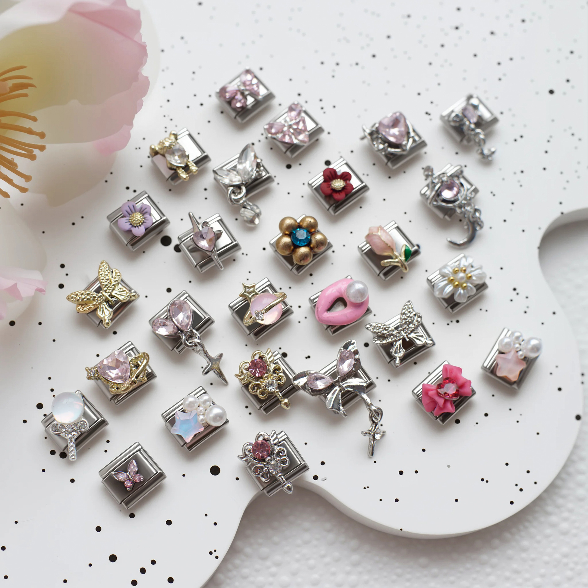 Stainless Steel Italian Module Bracelet Dream Pink Rhinestone Flower DIY Elastic Bracelet Italian Charms