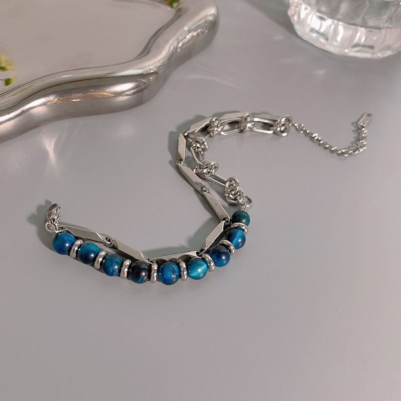 Double-layer Blue Tiger Eye Stone titanium steel bracelet men's and women's ins design sense national fashion niche retro hip hop bracelet accessories