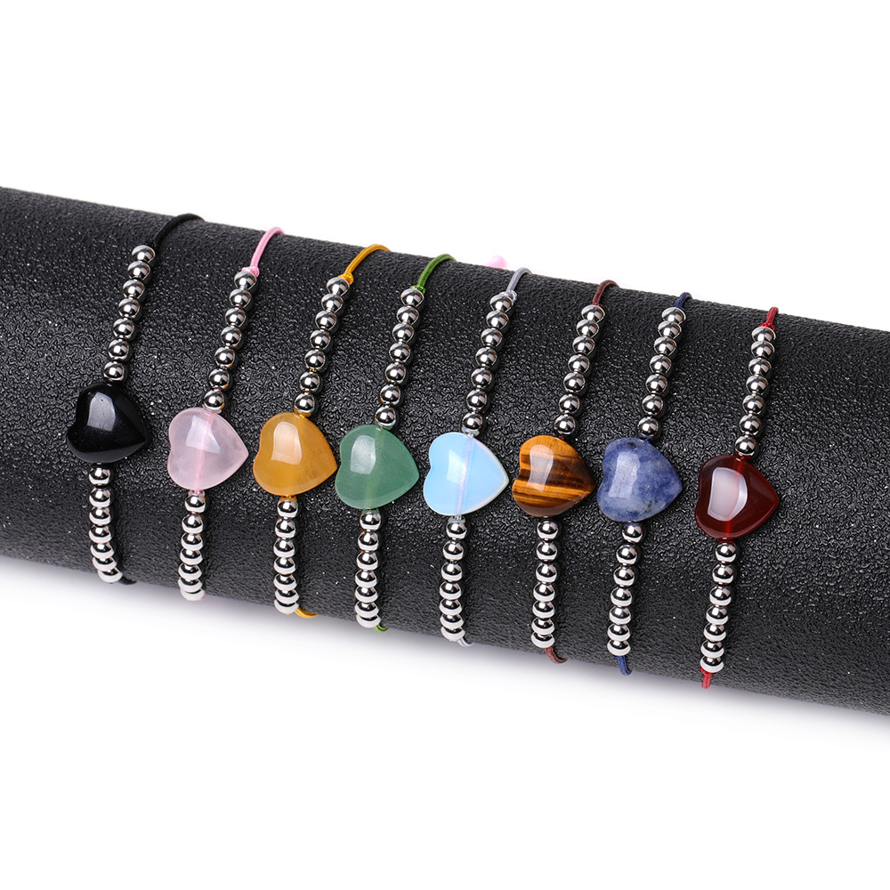 Stainless steel round beads love natural stone lanyard bracelet Tiger Eye Stone peach heart woven pink crystal green aventurine pendant heart