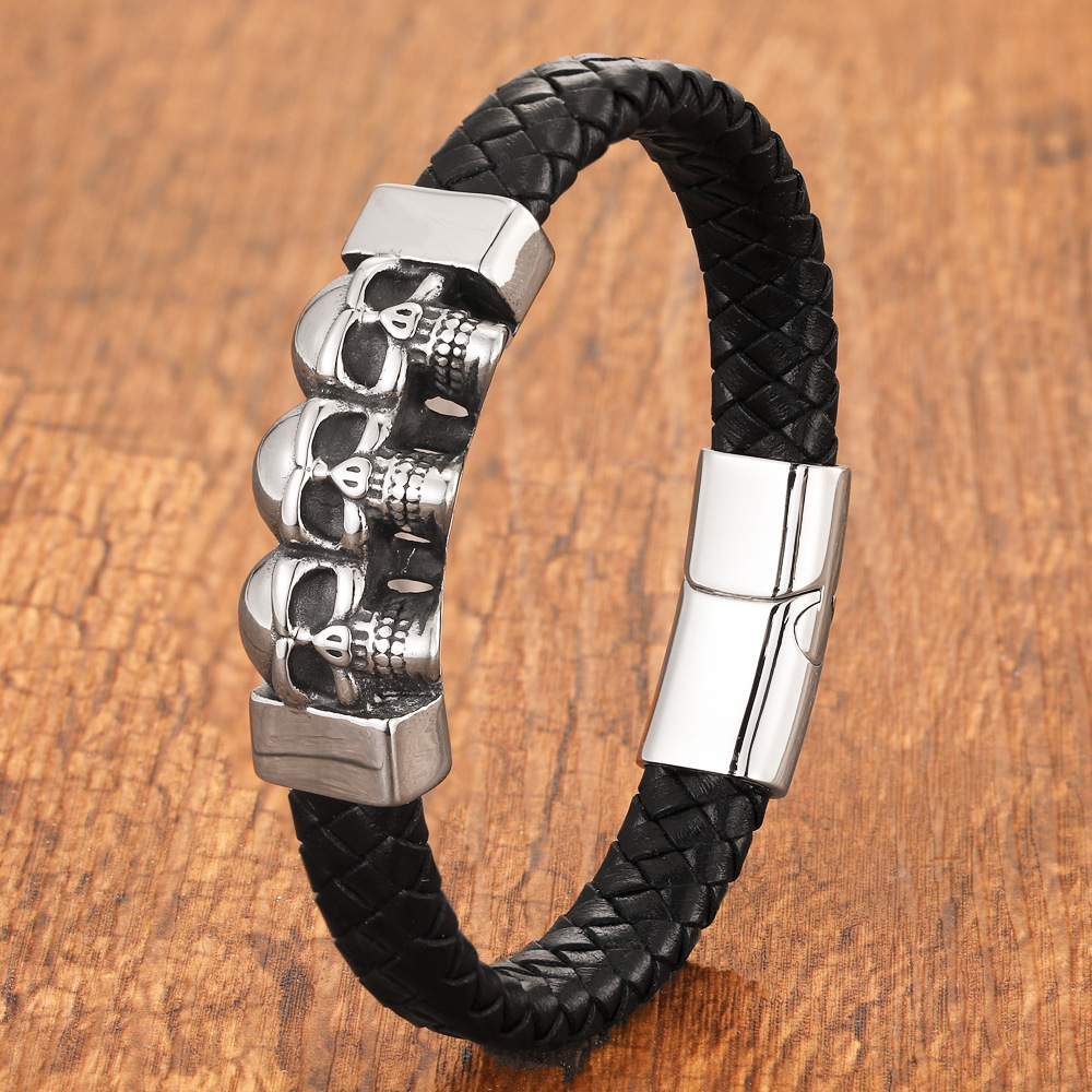 New cross-border creative punk skull men's bracelet stainless steel magnet buckle woven leather vintage bracelet