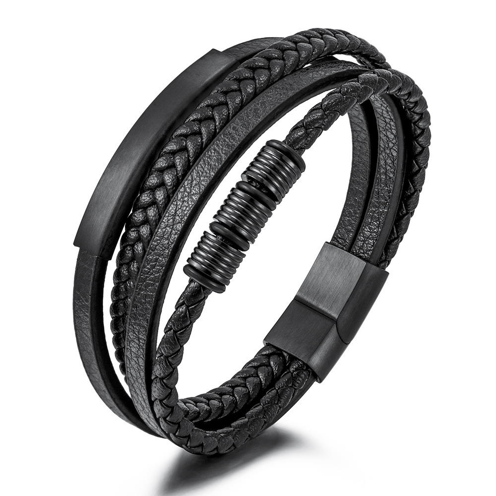 Black leather rope cowhide men's double stainless steel leather woven bracelet handmade multi-layer leather bracelet L20240