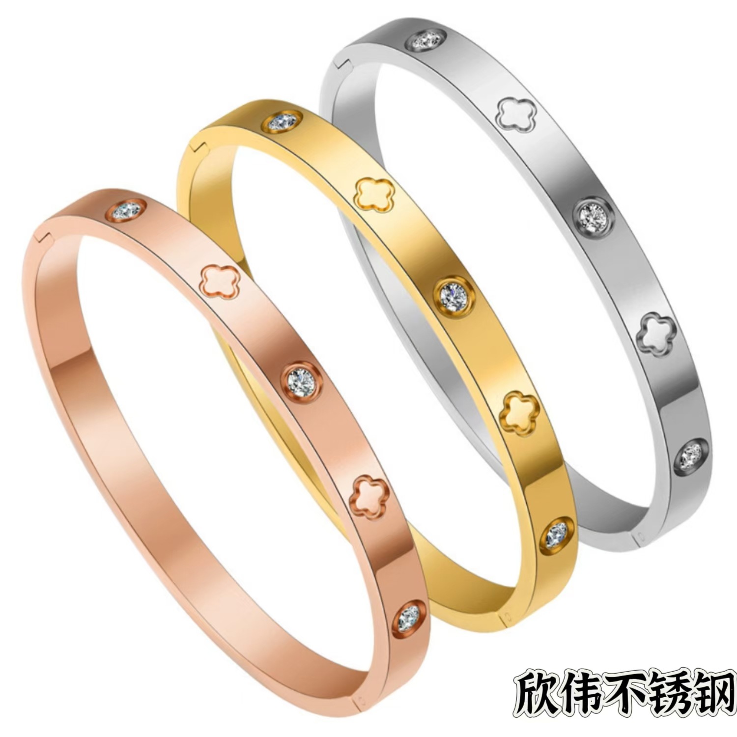 Classic buckle opening fashion men's and women's bracelet rose gold 18k lucky four leaf flower love diamond titanium steel bracelet